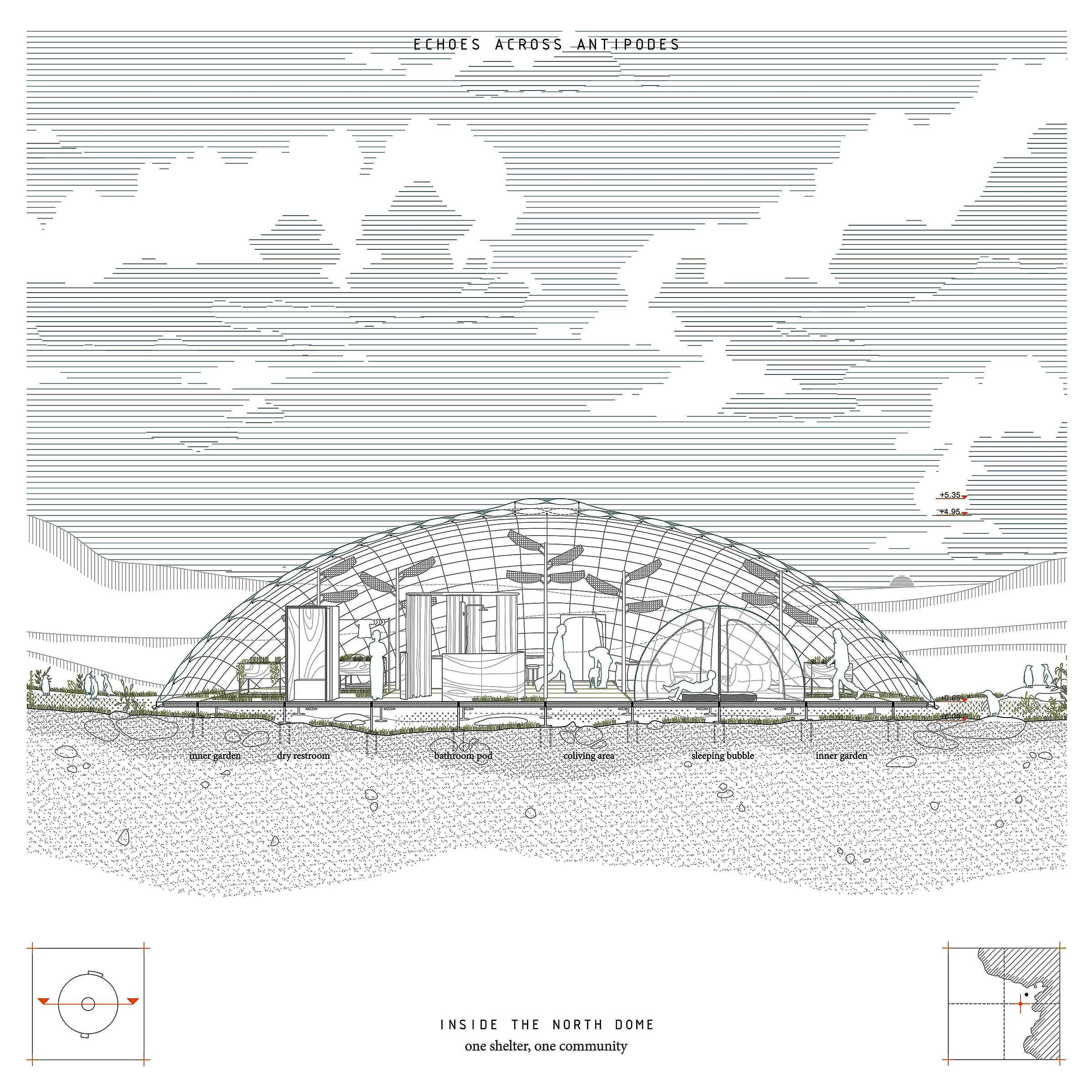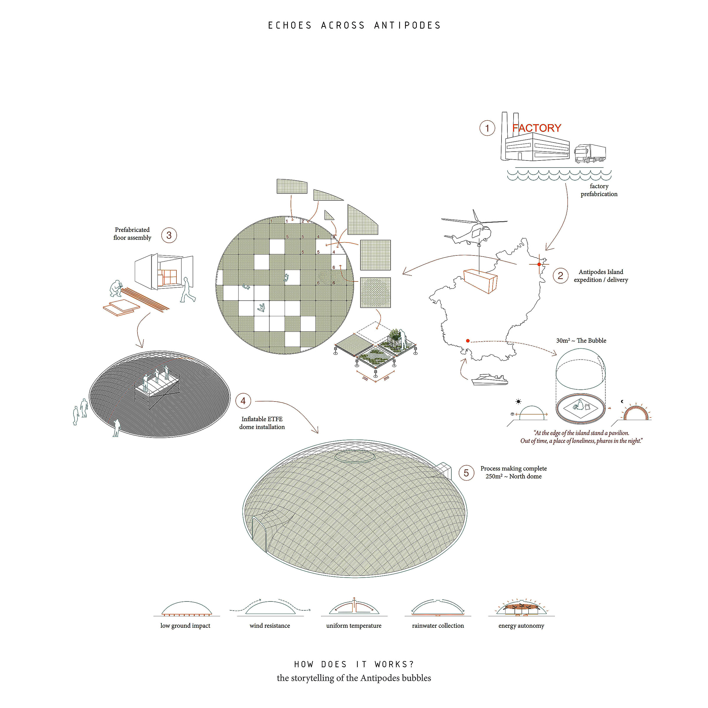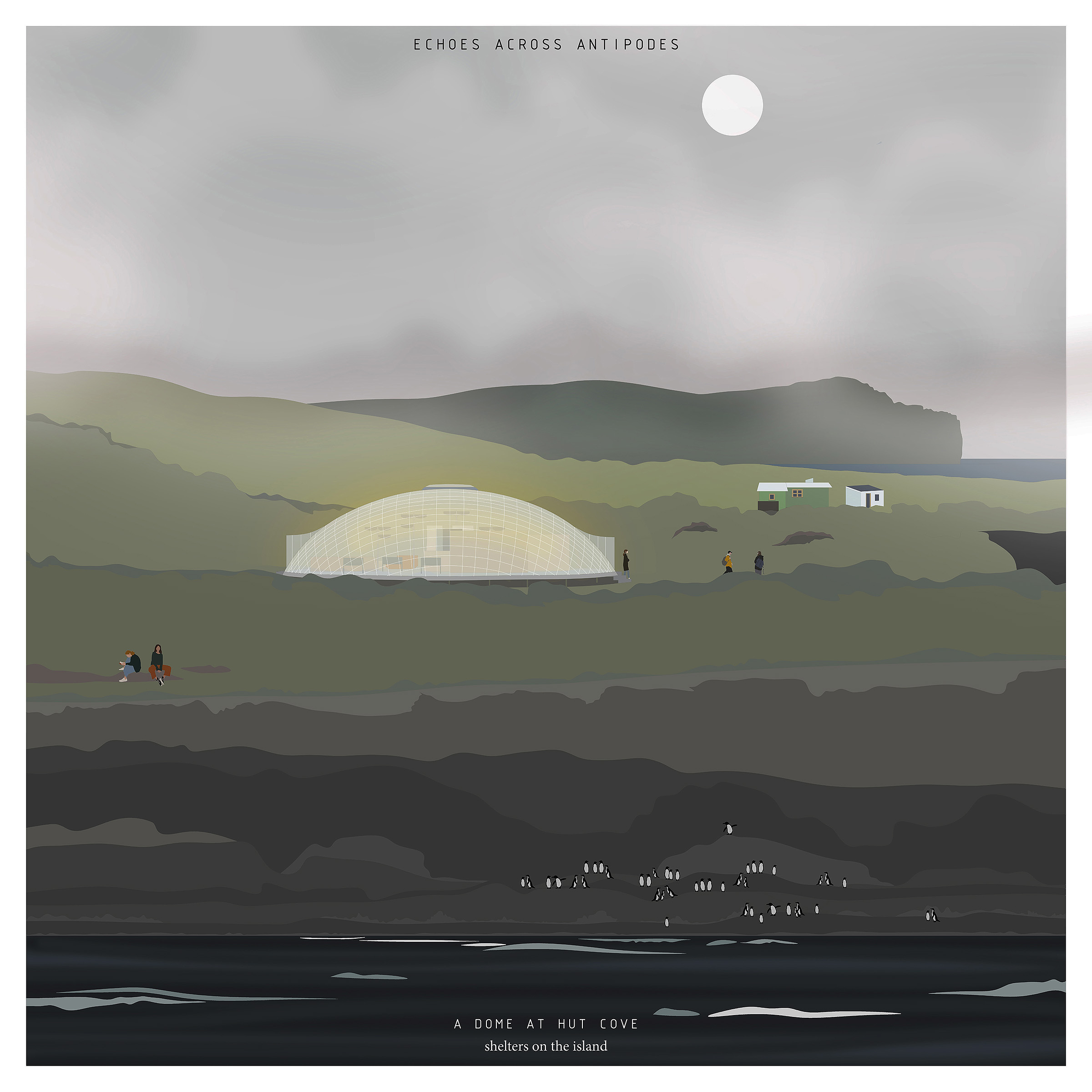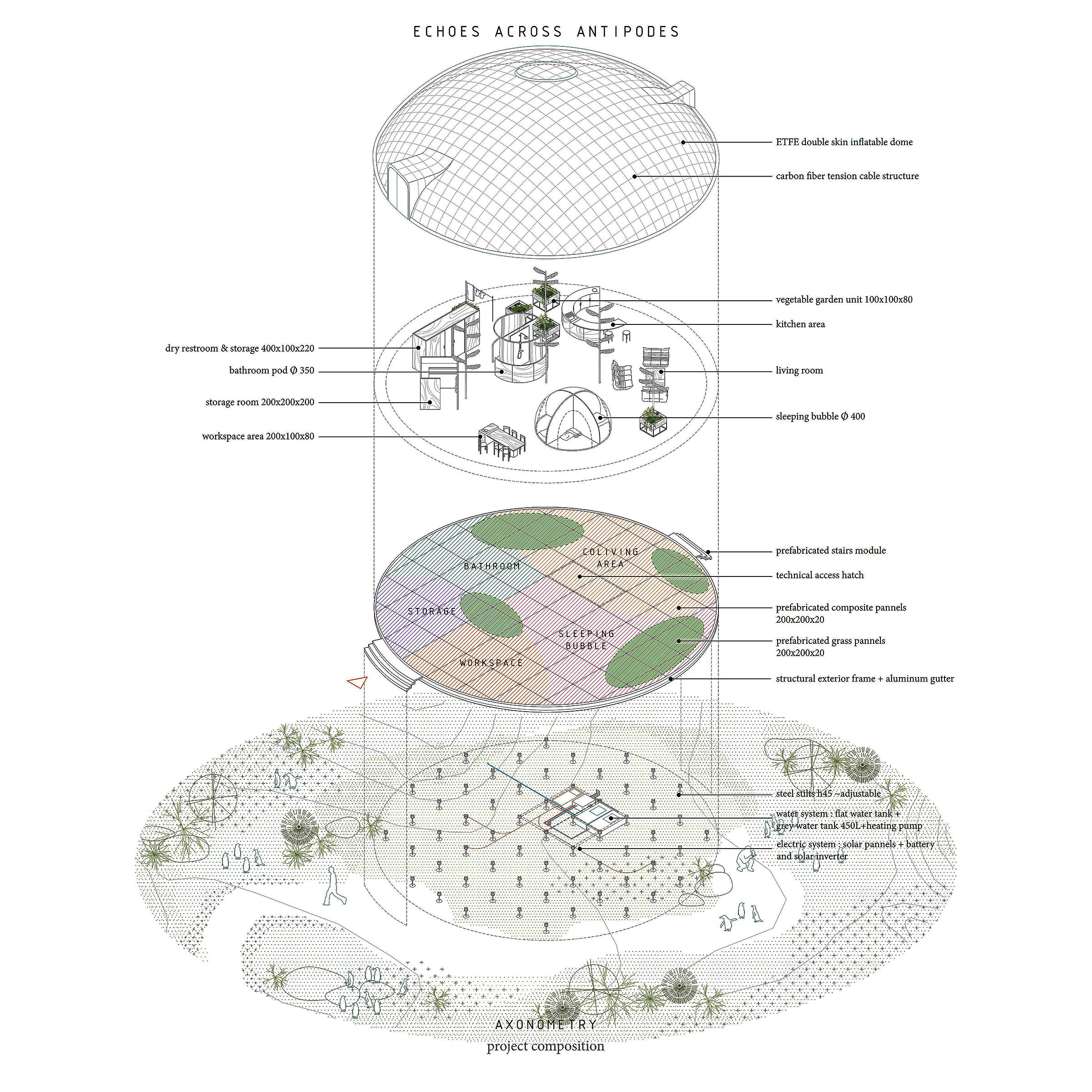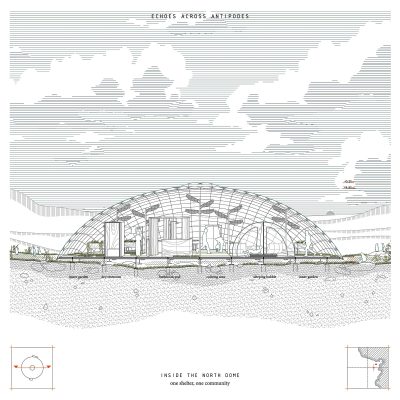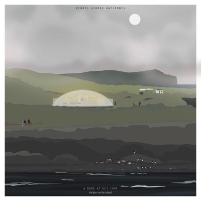 Antipodes Island, shaped by extremes and contrasts, gives rise to a project built on dualities — between North and South, togetherness and isolation, shelter and reflection. Two “echoes” respond to the singular nature of this remote land. To the North, anchored in volcanic rock, the main Dome emerges as a translucent, inhabitable shell. At 250m2, it is both a refuge and living system — a place of collective effort and adaptability. Its open interior is structured by a floor grid inspired by botanical quadrat, where essential functions (work/shower/kitchen/sleeping/restroom) are treated as distinct modules. Rainwater is stored beneath the raised floor, and a dense field of solar panels powers the structure. Prefabricated composite slabs allow for efficient assembly. Indoor gardens sustain daily life, transforming the dome into a self-sufficient habitat. To the South, discreet across the rugged landscape, the Bubble, a minimal inflatable pavilion offers a quiet and favorable space for introspection. Set near the site of a 19th-century shipwreck, it is the paroxysms reflect for solitude and contemplation. More than a shelter, the project inhabits the edge — a fragile balance drawn from the very oppositions that shape Antipodes Island.