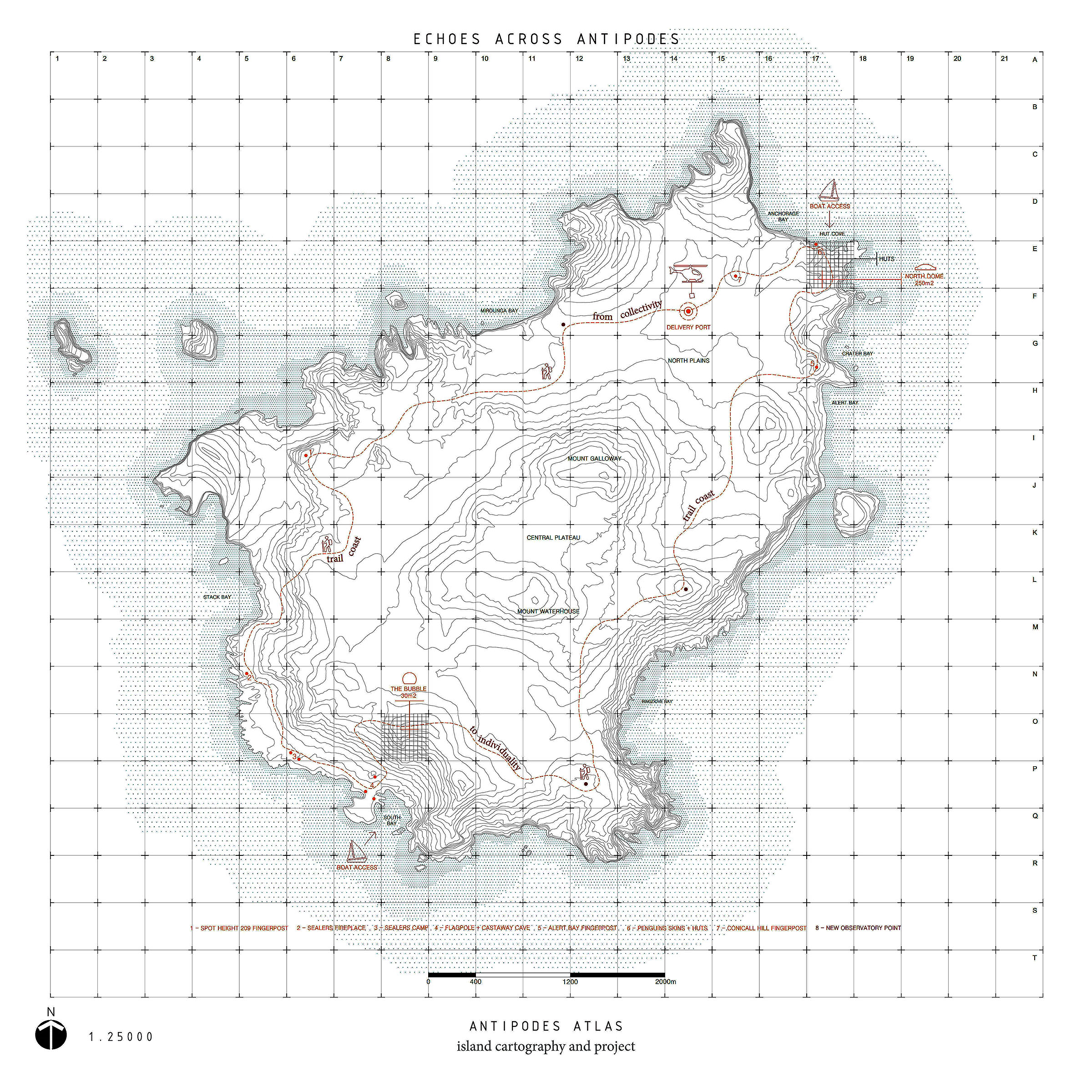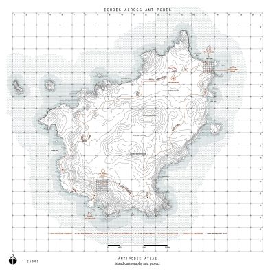 극단과 대비로 형성된 안티포드 섬은 북과 남, 공존과 고립, 보호와 성찰이라는 이중성 위에 놓인 하나의 건축적 제안을 탄생시킨다. 이 프로젝트는 이 외딴 땅의 특수한 조건에 응답하는 두 개의 ‘에코(Echo)’로 구성된다. 북쪽에는 화산암에 단단히 고정된 메인 돔이 자리한다. 반투명하고 거주 가능한 쉘로 형성된 이 돔은 250㎡ 규모로, 집단적 노동과 적응을 전제로 한 피난처이자 하나의 생활 시스템이다. 내부는 식물 생태 조사에 사용되는 보태니컬 쿼드랏(botanical quadrat)에서 착안한 바닥 그리드에 의해 조직되며, 작업·샤워·주방·취침·위생과 같은 필수 기능들은 각각 독립된 모듈로 구성된다. 빗물은 지면에서 이격된 바닥 하부에 저장되고, 조밀하게 배치된 태양광 패널은 구조물 전체에 에너지를 공급한다. 프리패브 복합 슬래브 시스템을 통해 효율적인 조립이 가능하며, 실내 정원은 일상적 삶을 유지하게 함으로써 돔을 자급적인 거주 환경으로 완성한다. 남쪽의 험준한 지형 속에는 보다 은밀한 버블(Bubble)이 놓인다. 최소한의 공기주입식 파빌리온인 이 공간은 내밀하고 고요한 성찰을 위한 장소로, 19세기 난파선이 있었던 지점 인근에 위치한다. 이 버블은 고립과 사유가 극대화되는 순간을 담아내는 장치다. 이 프로젝트는 단순한 피난처를 넘어, 안티포드 섬을 형성해 온 대립적 조건들 사이의 섬세한 균형, 그 경계 위에 놓여있다.