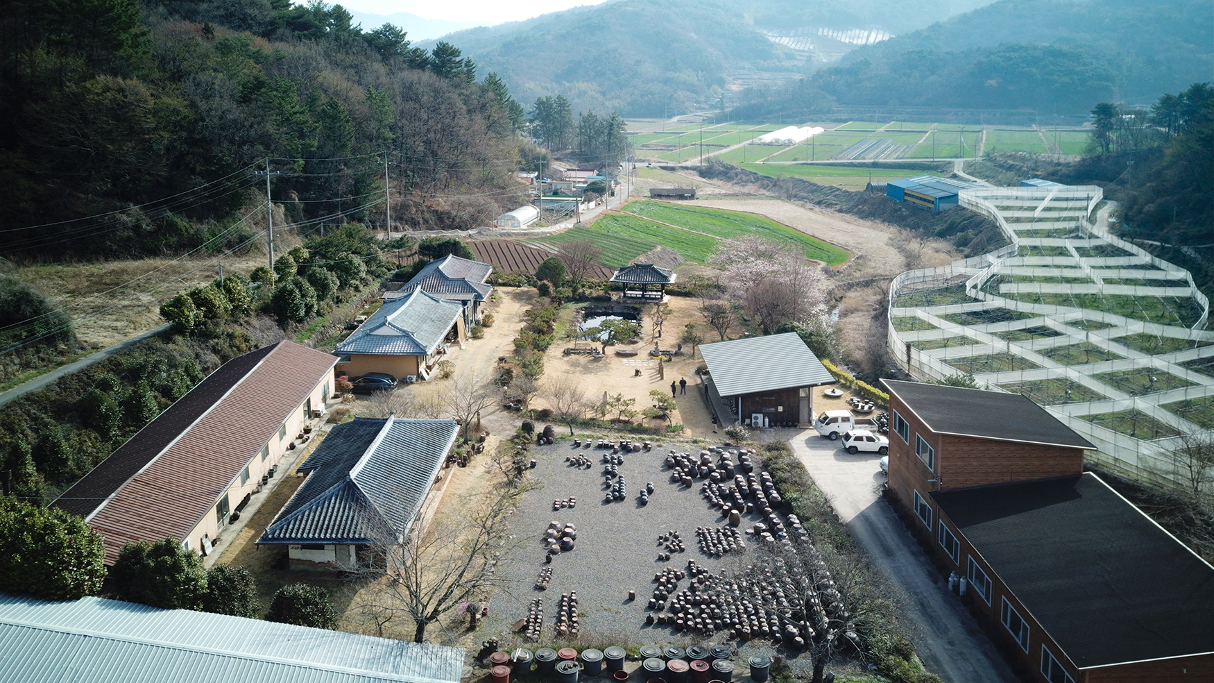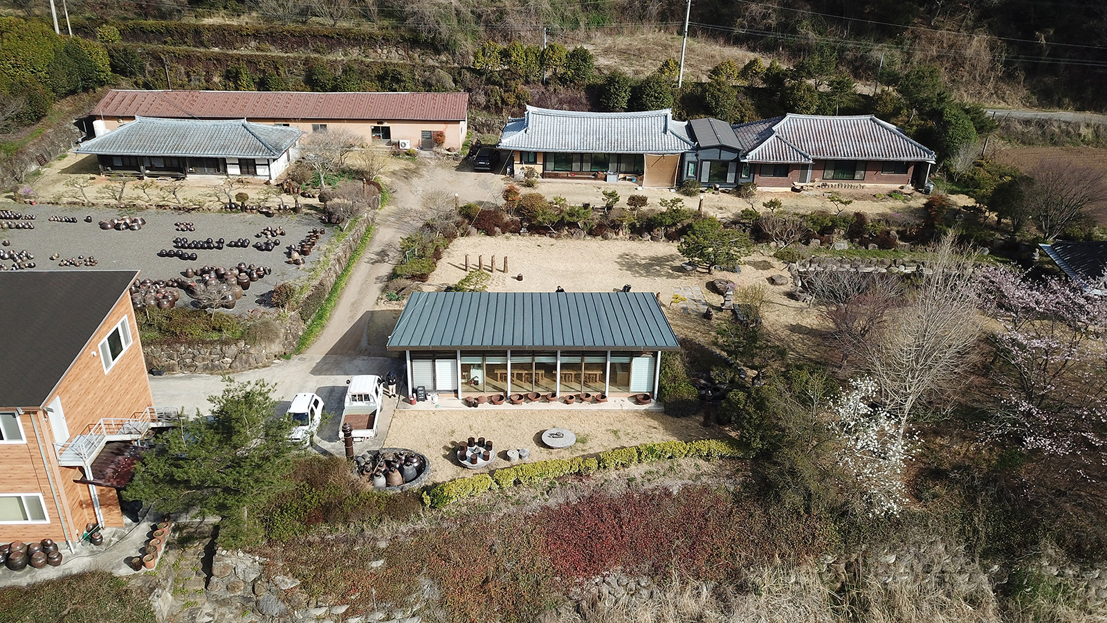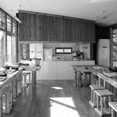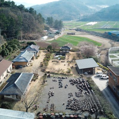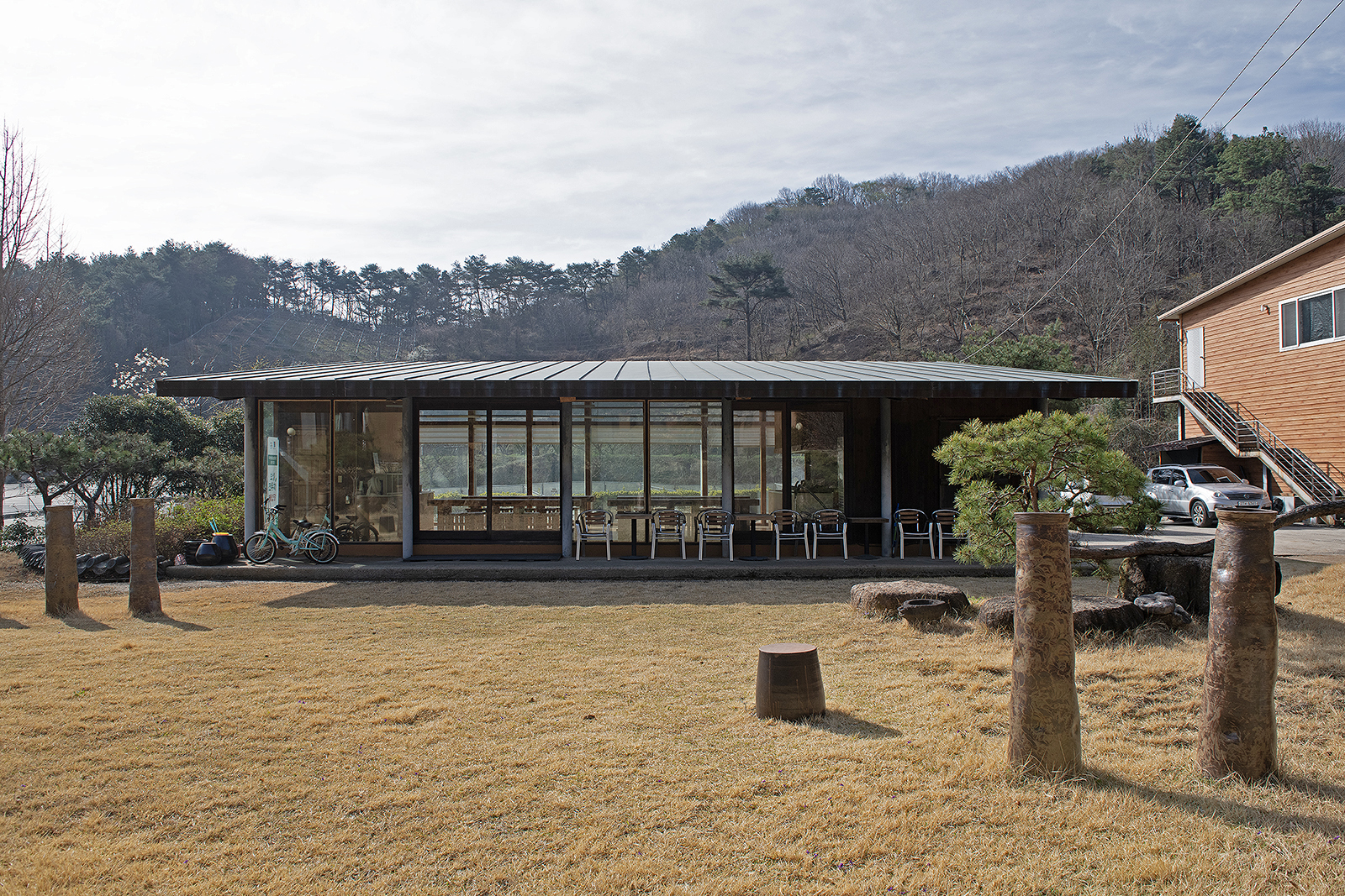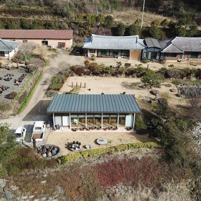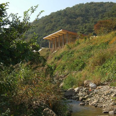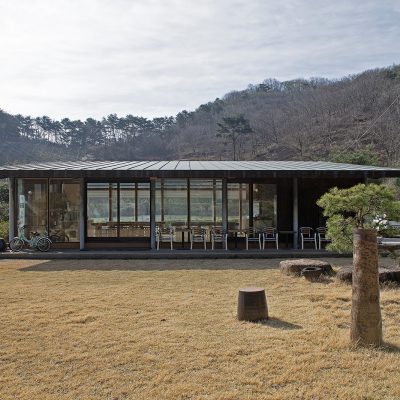 Located within the Jingkwang Cultural Complex in Beolgyo, Boseong, Jeollanam-do, this tea & culinary experience space is conceived as a lightweight steel pavilion that draws the mountain landscape deep into the interior. A simple sloping roof defines an open spatial field that establishes a direct visual relationship with the site, allowing the surrounding scenery to extend seamlessly into the building. The restrained expression of the steel structure emphasizes clarity and lightness, enabling the architecture to act as a frame for experience rather than an autonomous object. Despite its modest scale, the project achieves a strong spatial presence through structural legibility and openness, creating a quiet setting in which tea culture and landscape are brought into close dialogue.