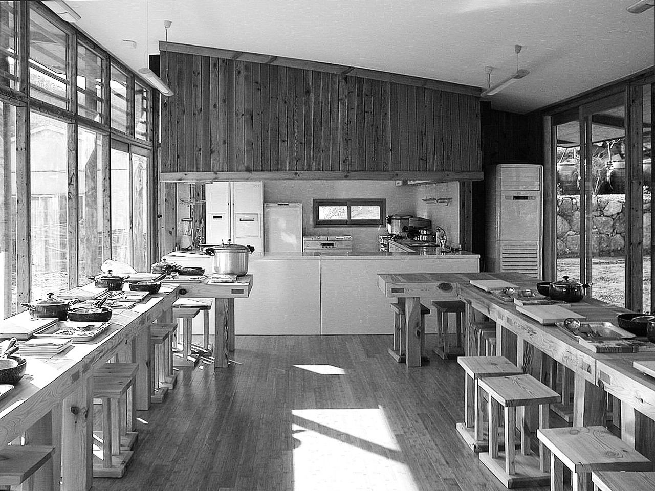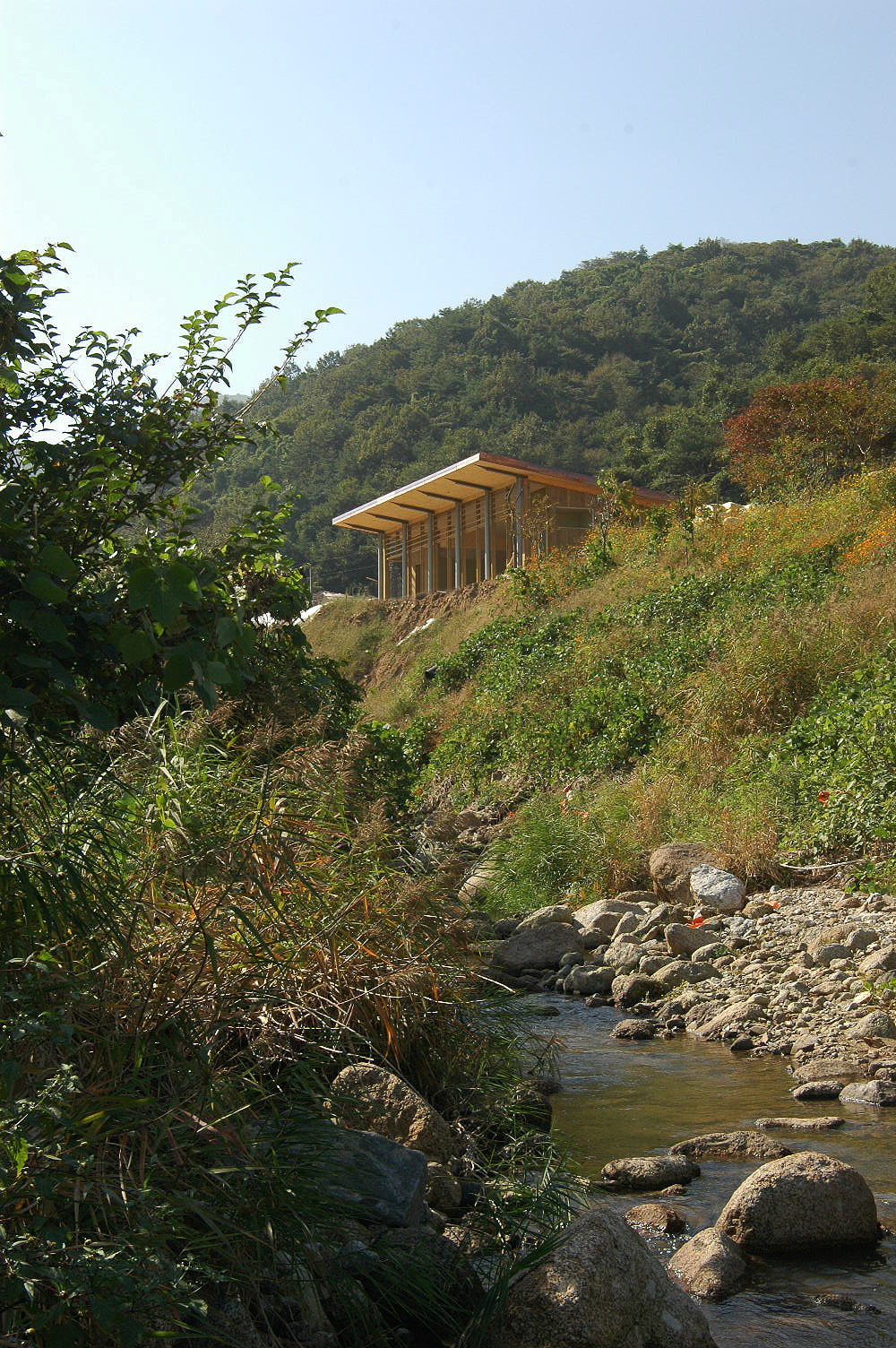 전남 보성 벌교의 징광문화 단지 내에 위치한 이 차 체험 공간은 정면의 산자락을 실내 깊숙이 끌어들이기 위해 계획된 경량 철골 파빌리온이다. 단순한 경사 지붕 아래 열린 공간은 주변 풍경을 자연스럽게 내부로 연결하며, 절제된 구조는 건물이 스스로를 드러내기보다 장소의 경험을 담아내는 틀로 작동하도록 한다. 작은 규모이지만 명료한 구조와 개방적인 공간을 통해 차 문화와 자연 환경이 조용히 만나는 건축적 장면을 만든다.